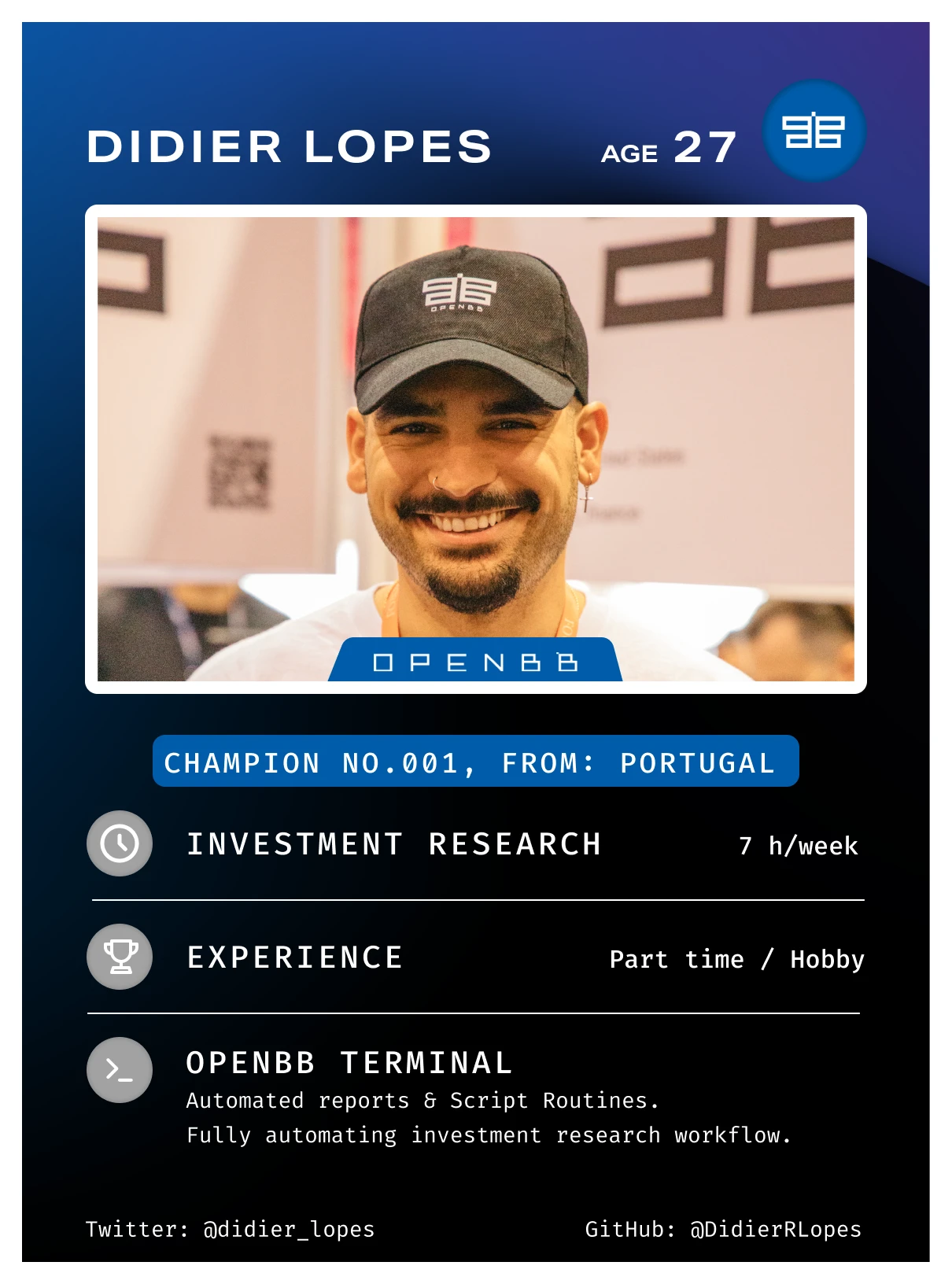 At OpenBB, we are actively seeking out OpenBB Champions — passionate community members who share our vision of democratizing investment research through an open source approach.