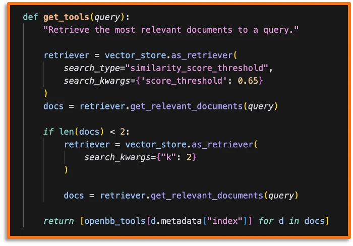 This is the function that the agent uses to retrieve the right subset of tools to answer each of the subtasks. Empirically, we found good results by using the similarity score threshold of 0.65. In other words, we retrieve all tools with descriptions that return a better similarity score than that value. In the case where the search yields less than two tools, we return the 2 tools with the highest similarity score instead.
