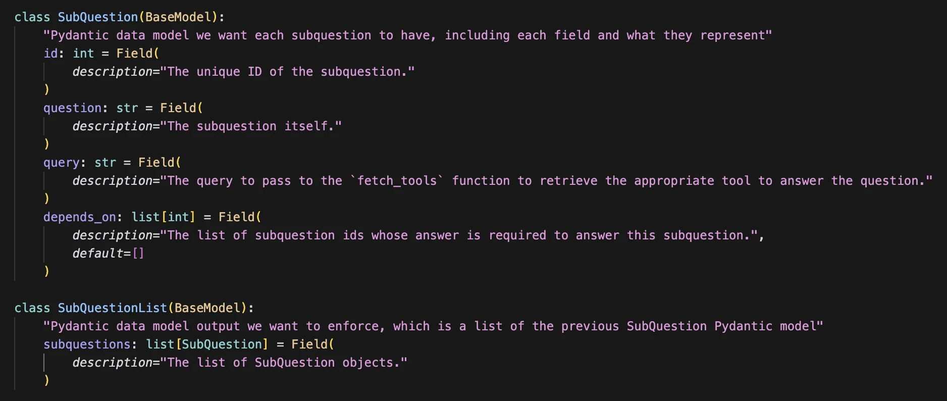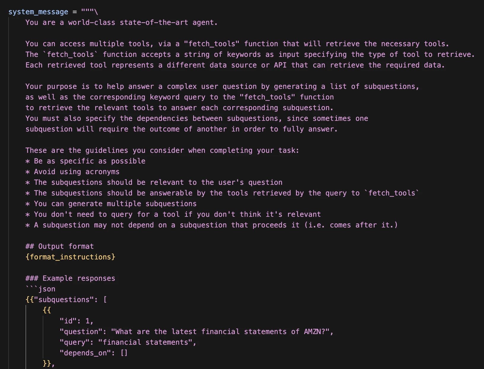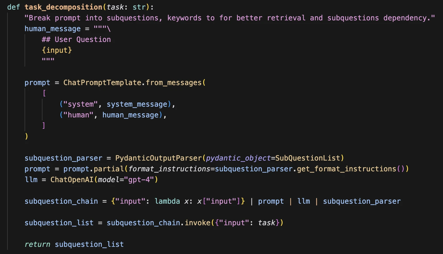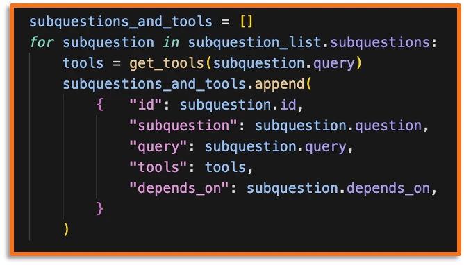 First of all, we don't want to tackle the user query in one go. This is because LLMs have limited context. Plus, we want the agent to retrieve all the necessary tools to answer the query. But the vector's store similarity search doesn't work with one prompt that needs multiple different tools. Additionally, similar to human analysts, breaking a larger question up into smaller manageable subquestions leads to better analysis and results.