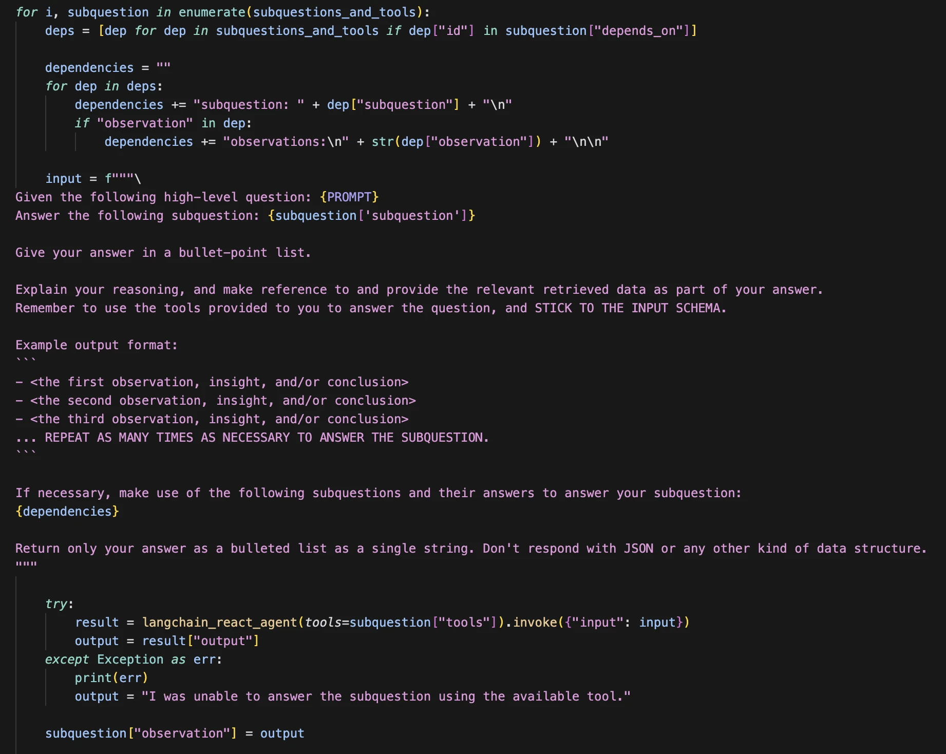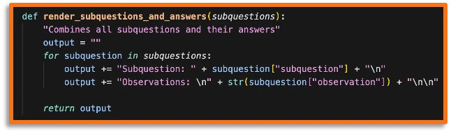 We then combine the entire context from subquestions and outputs to be given to the final agent: