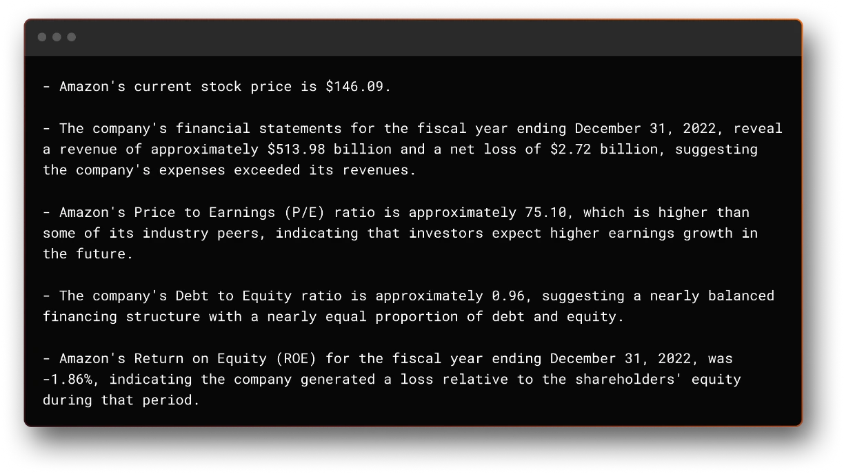 Rather than first building an AI-powered financial analyst for the sake of it, we instead started from what we wanted to achieve. We came up with two distinct prompts and our goal was for the agent to be able to successfully perform both of these, but utilizing the same underlying "agentic" architecture.