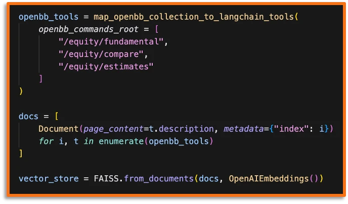 Each of these tool descriptions is converted into embeddings that can be retrieved later on based on the query the user provides. This allows our agent to pick the right tools for the job - i.e. if I want to have access to Apple's market cap, I want to get the tool equity.fundamentals.overview because I know that by providing the symbol AAPL I can get the market cap value.