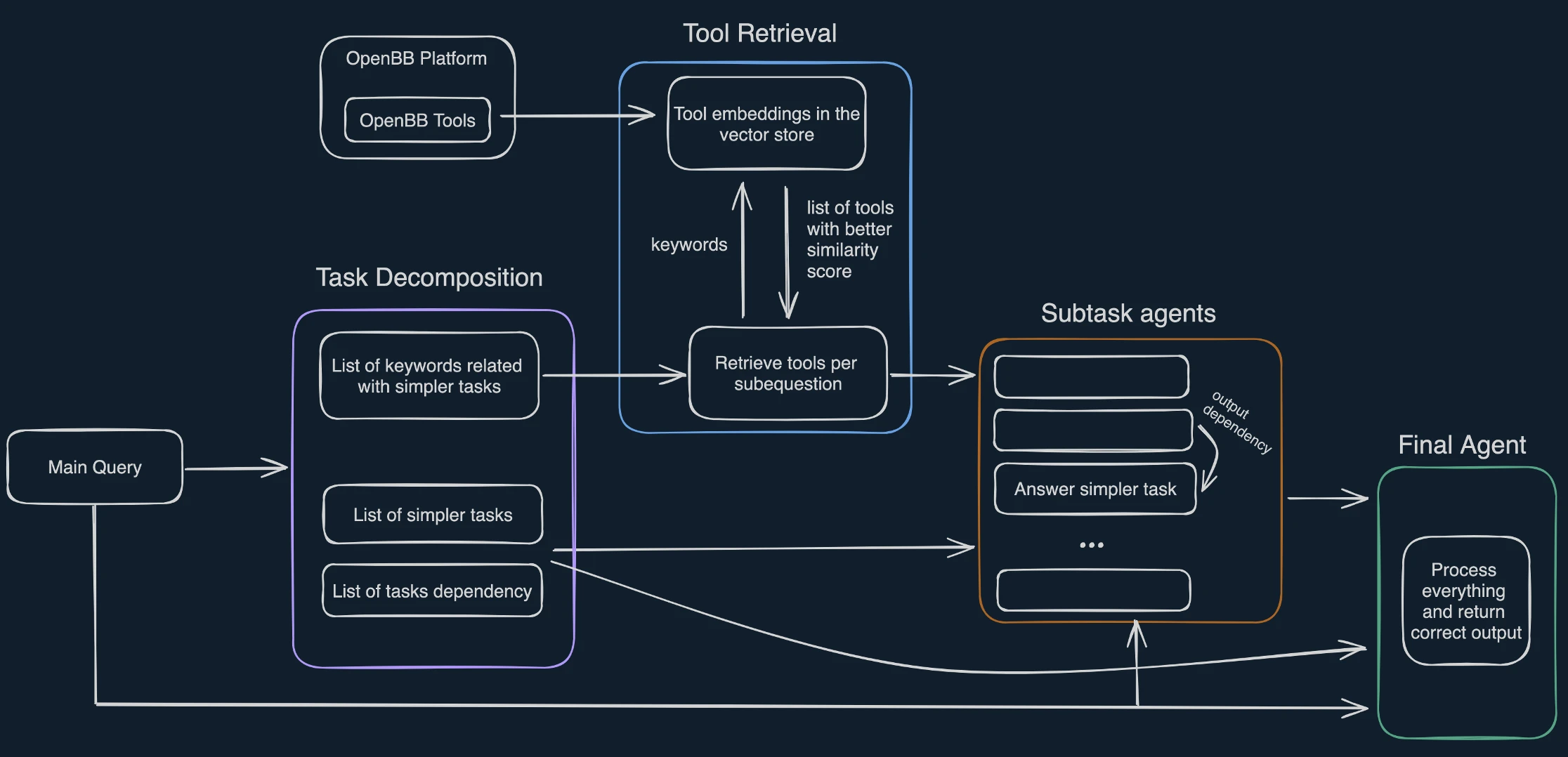 Each subtask agent is provided with the original query from the user, one of the subtasks from the task decomposition step, the output from another subtask agent IF there was a subtask dependency AND a set of retrieved tools necessary to answer the subtask.