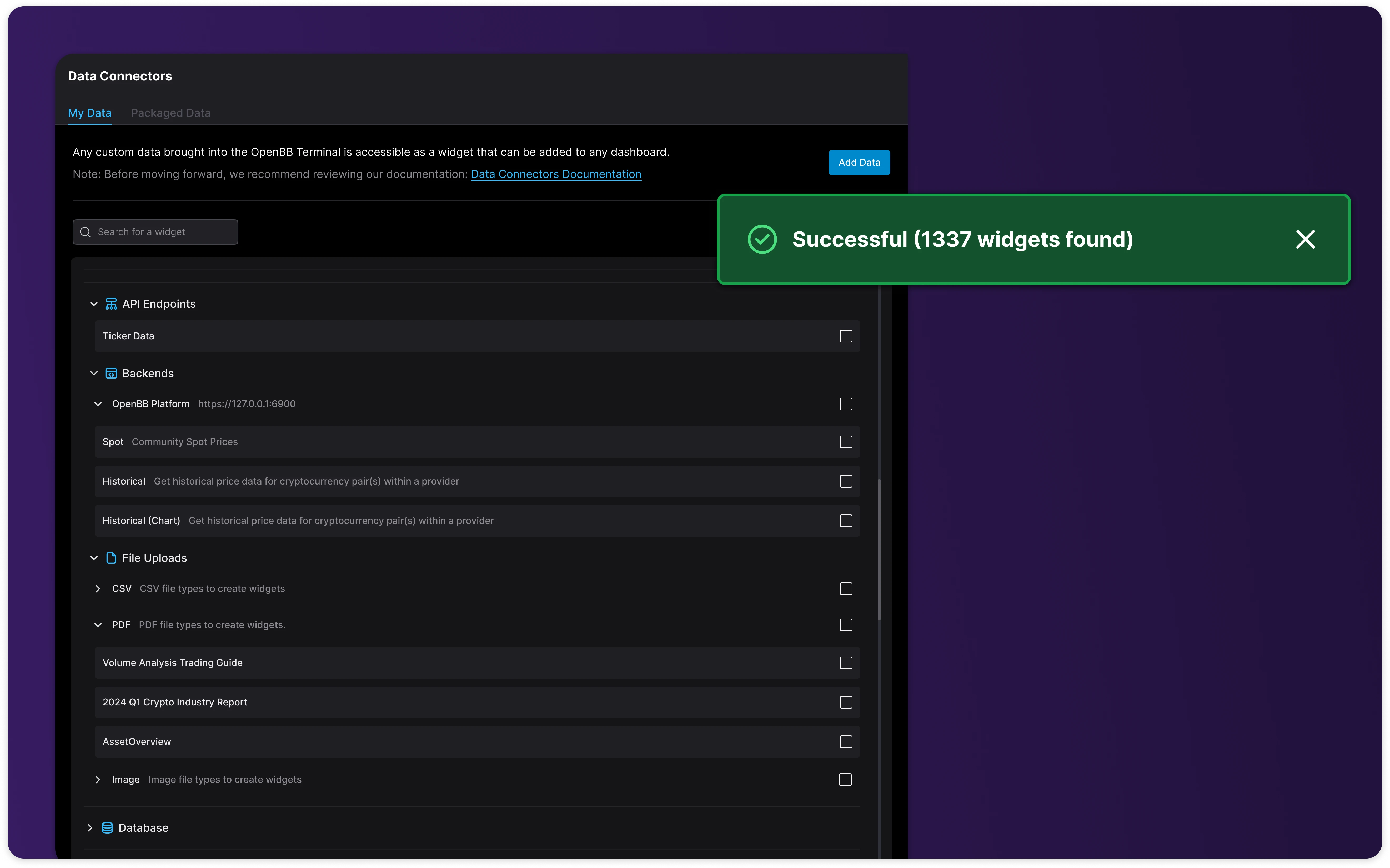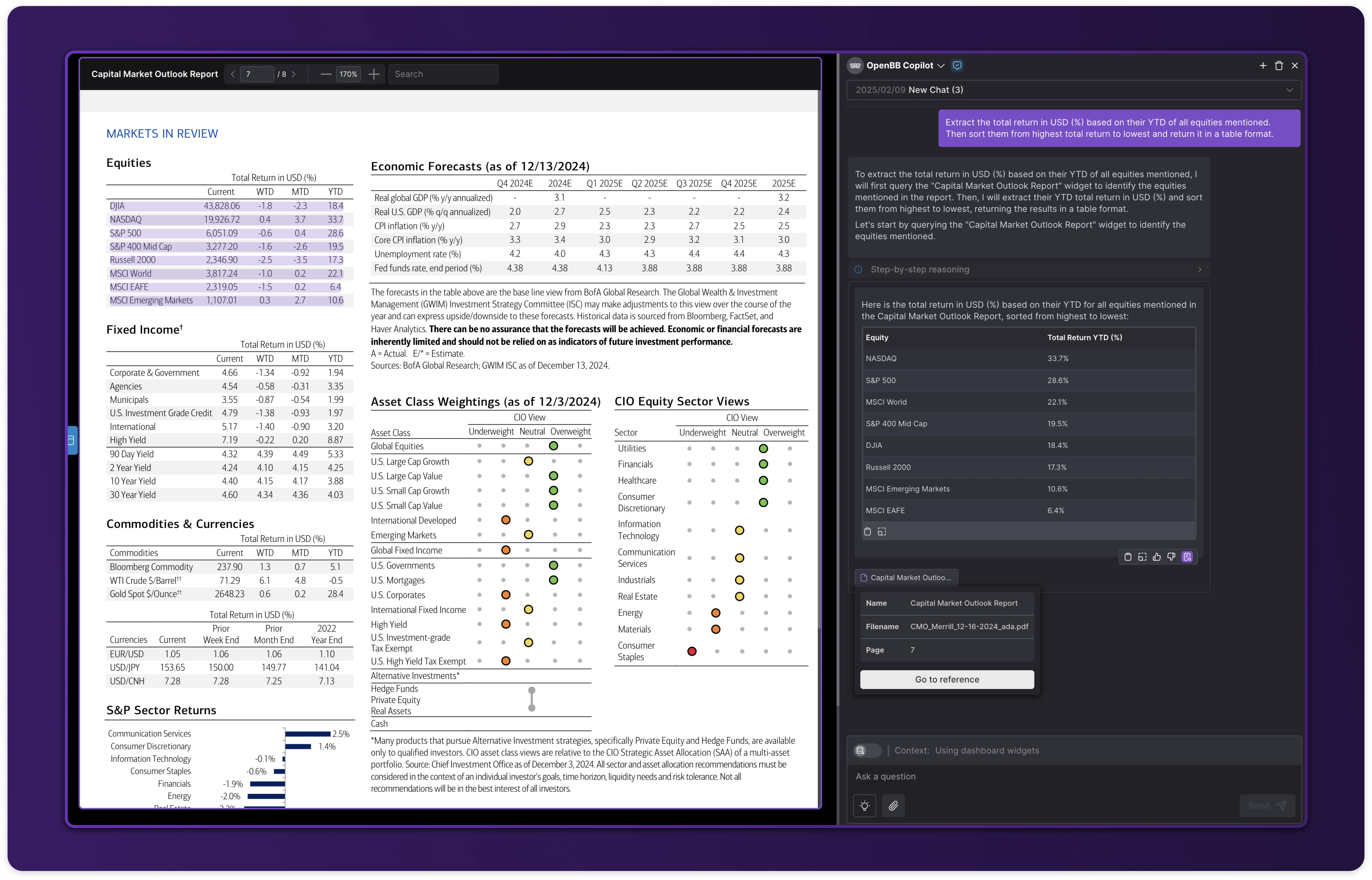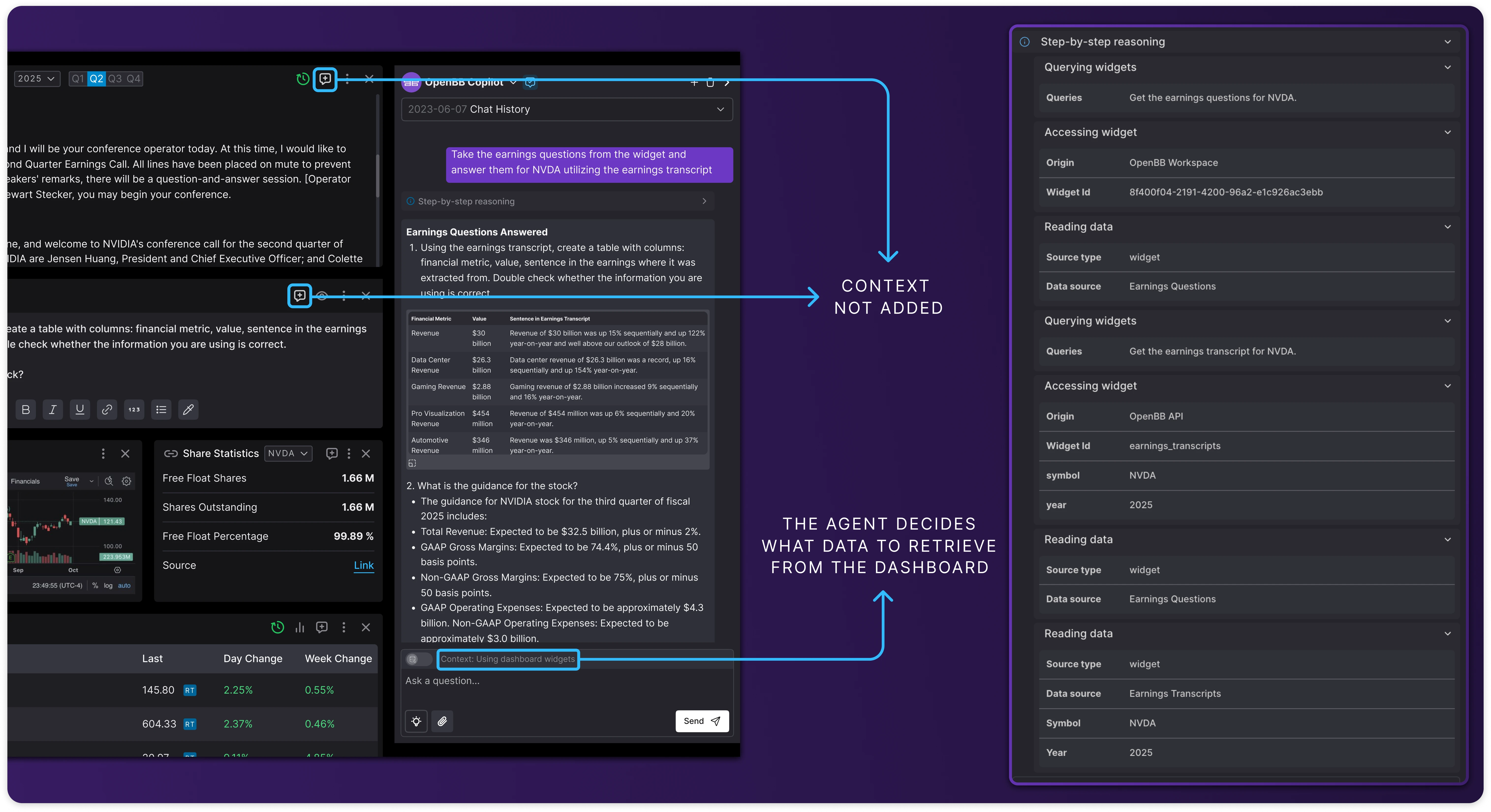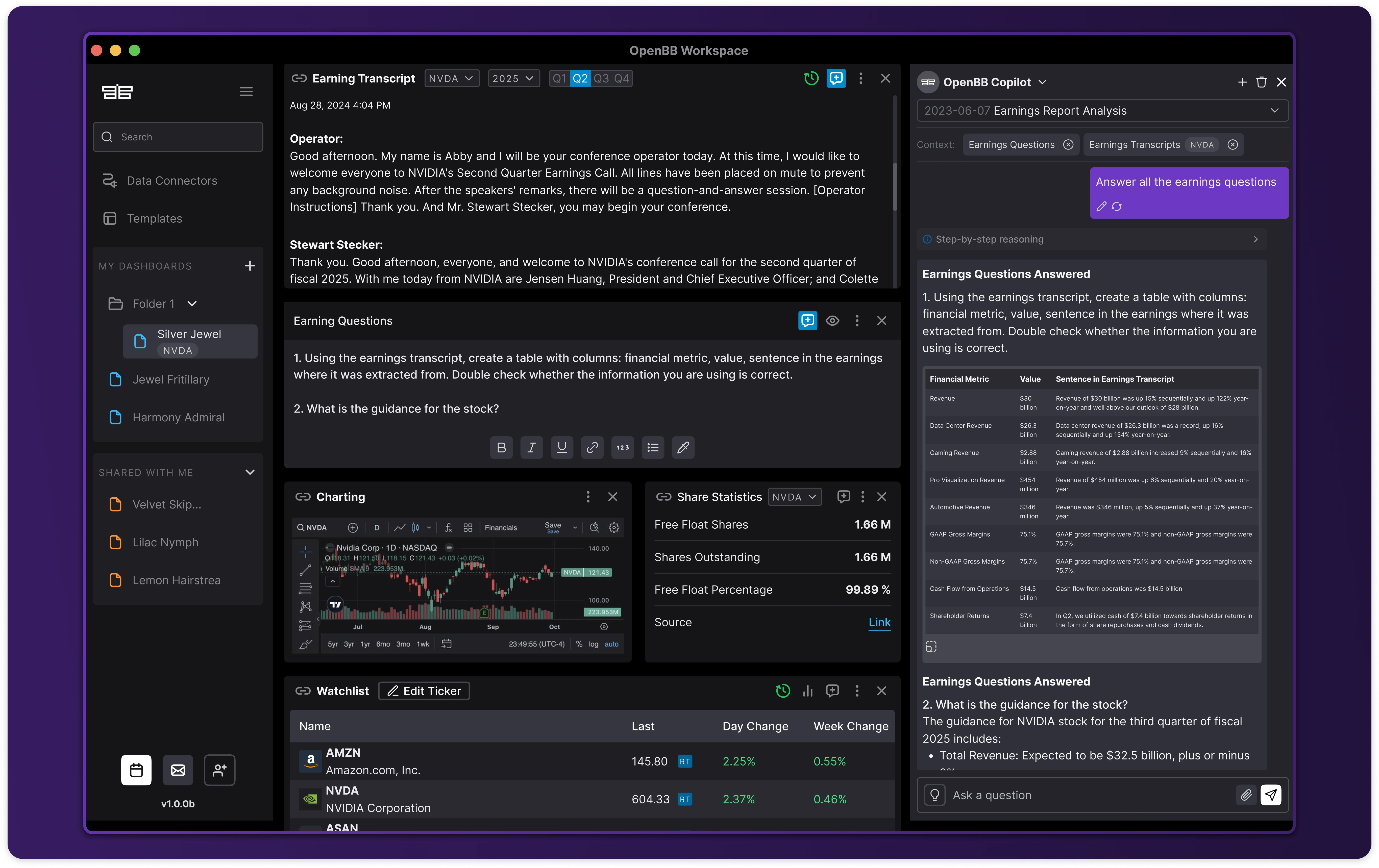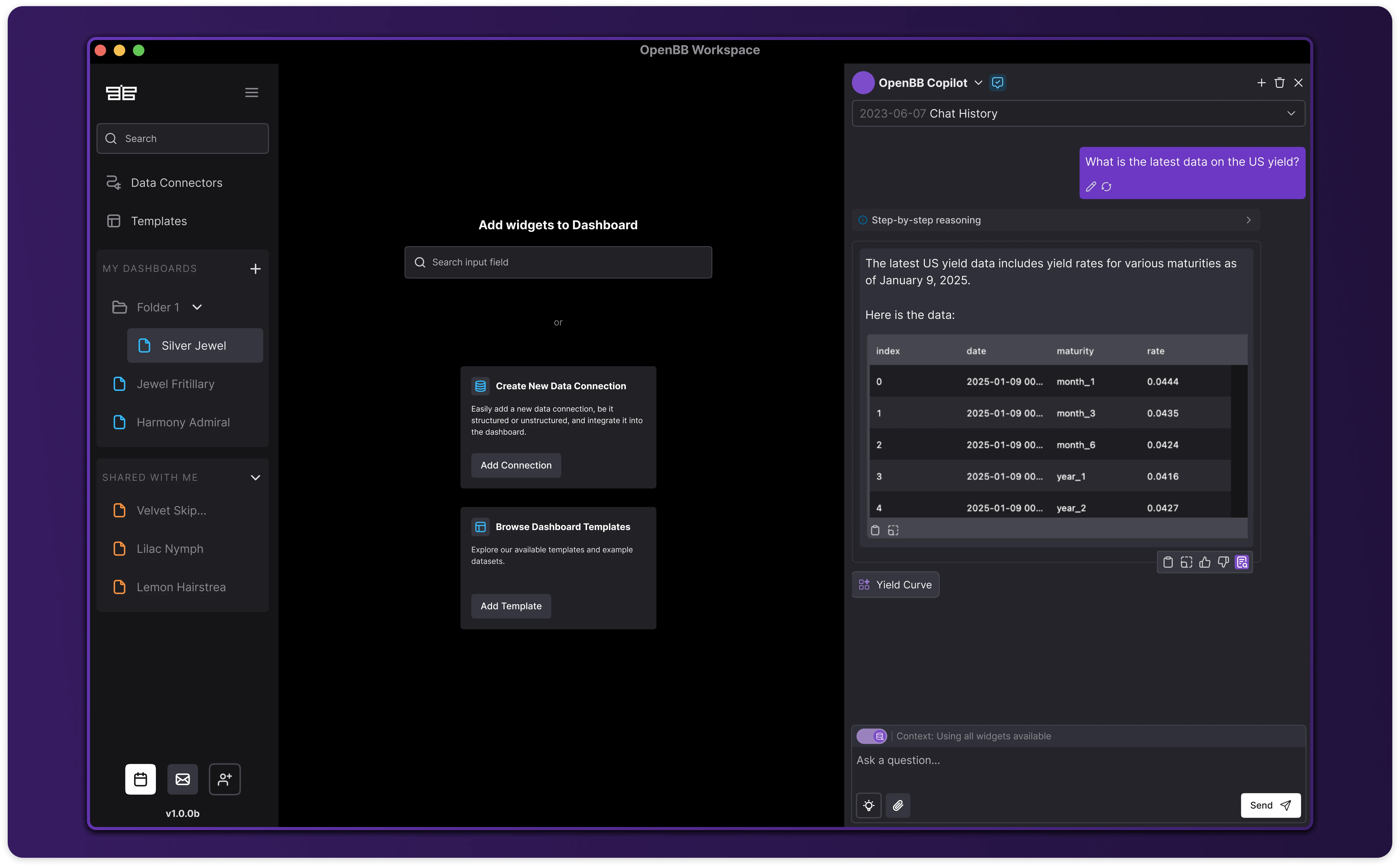 At the core of our product is the OpenBB workspace, a fully customizable dashboard where users can control their data visualization and analysis. The middle section shows a dashboard that you can fully customize with widgets containing relevant data widgets. We've designed it with a practical sidebar for managing dashboards, folder organization, sharing capabilities, templates, and data connections.