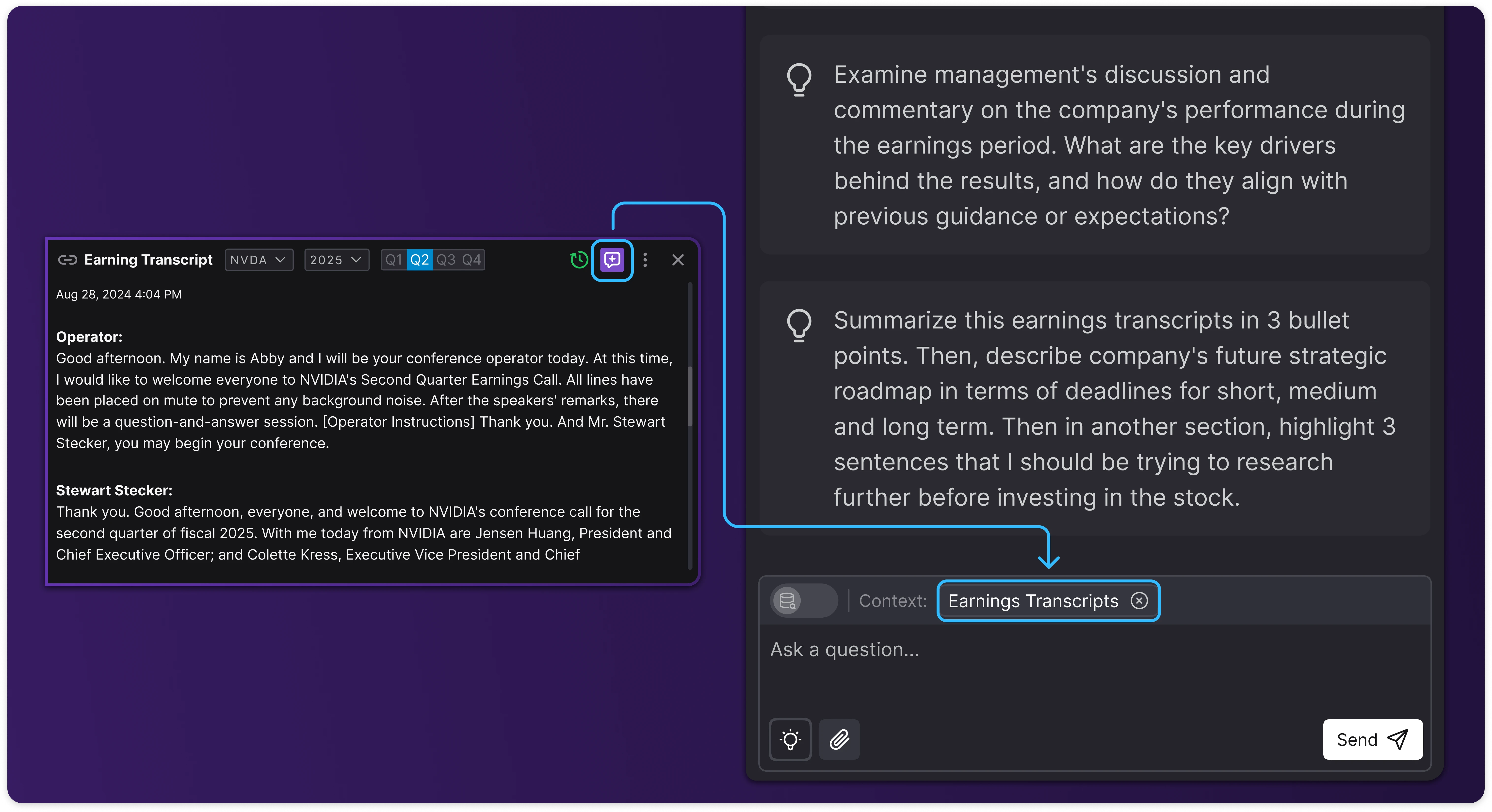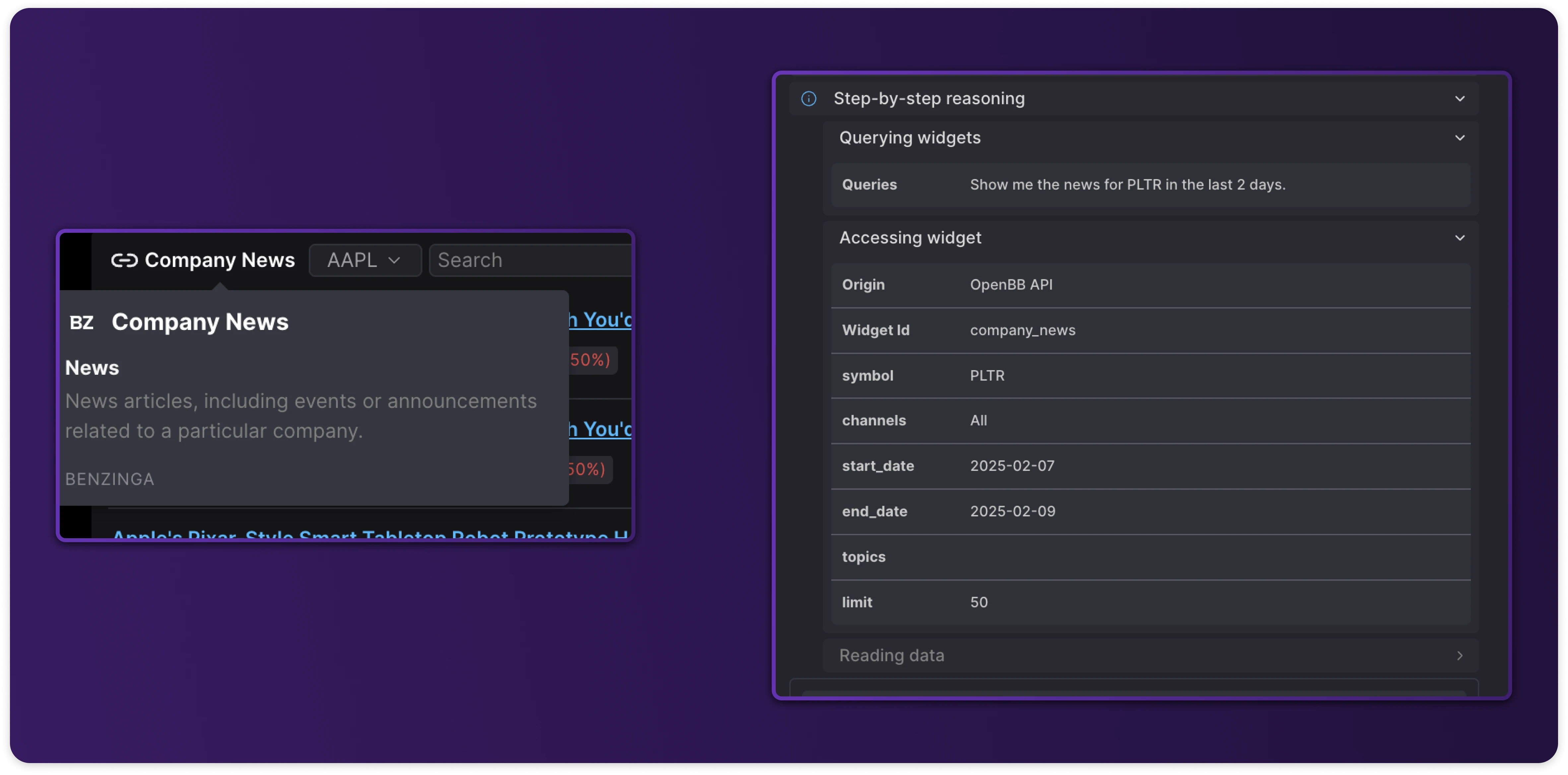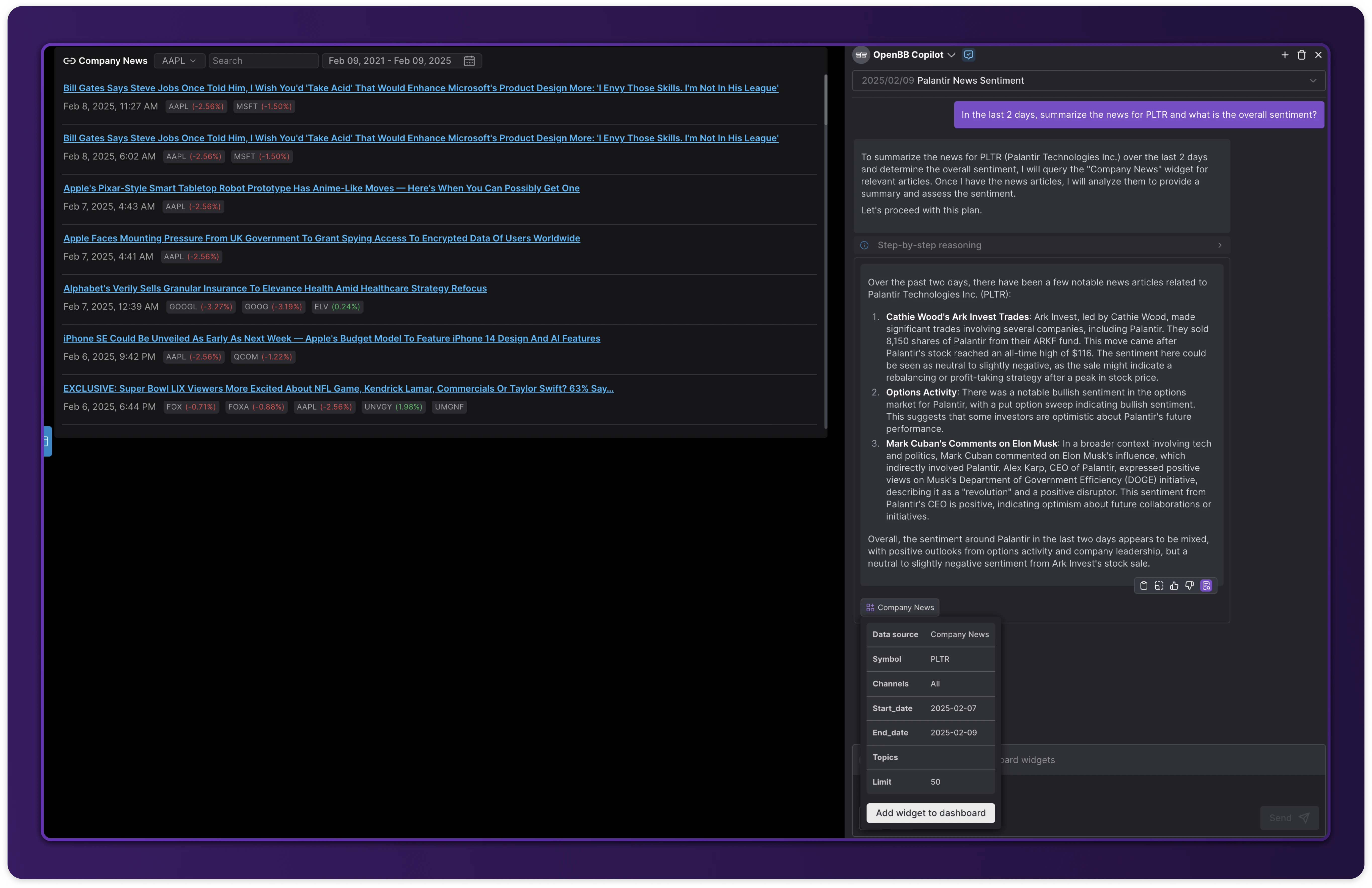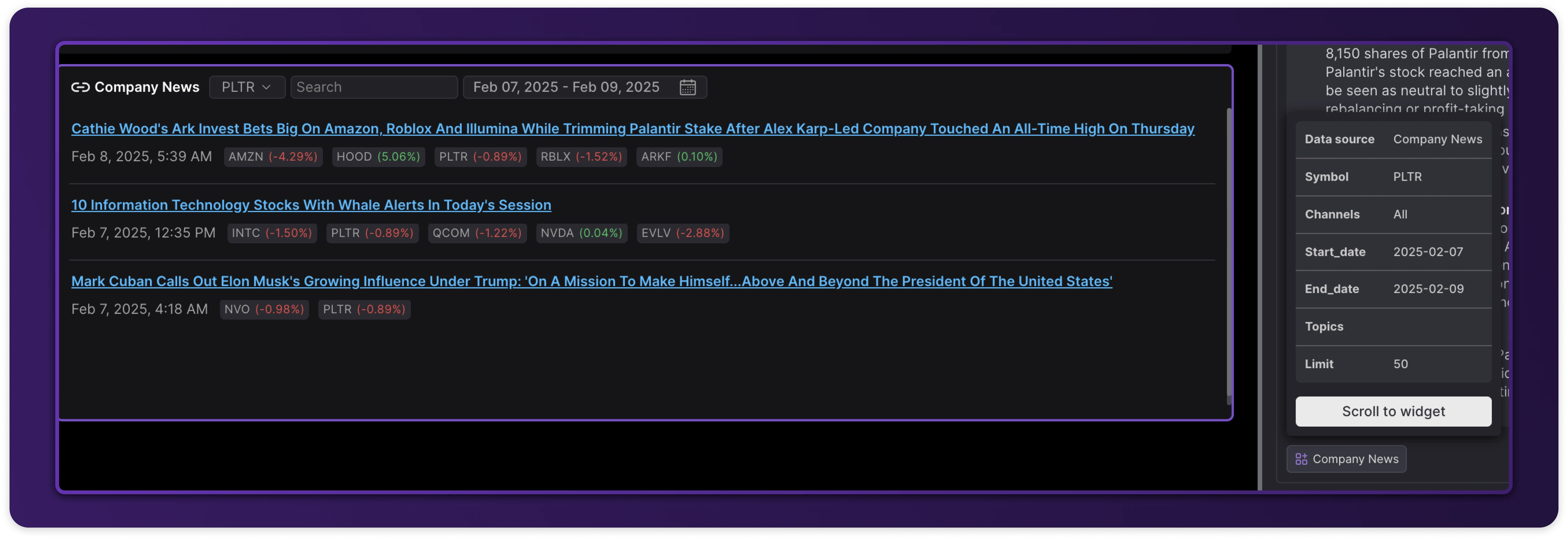 For instance, even if you're looking at Apple news, you can ask about Palantir, and our system will automatically adjust the parameters: