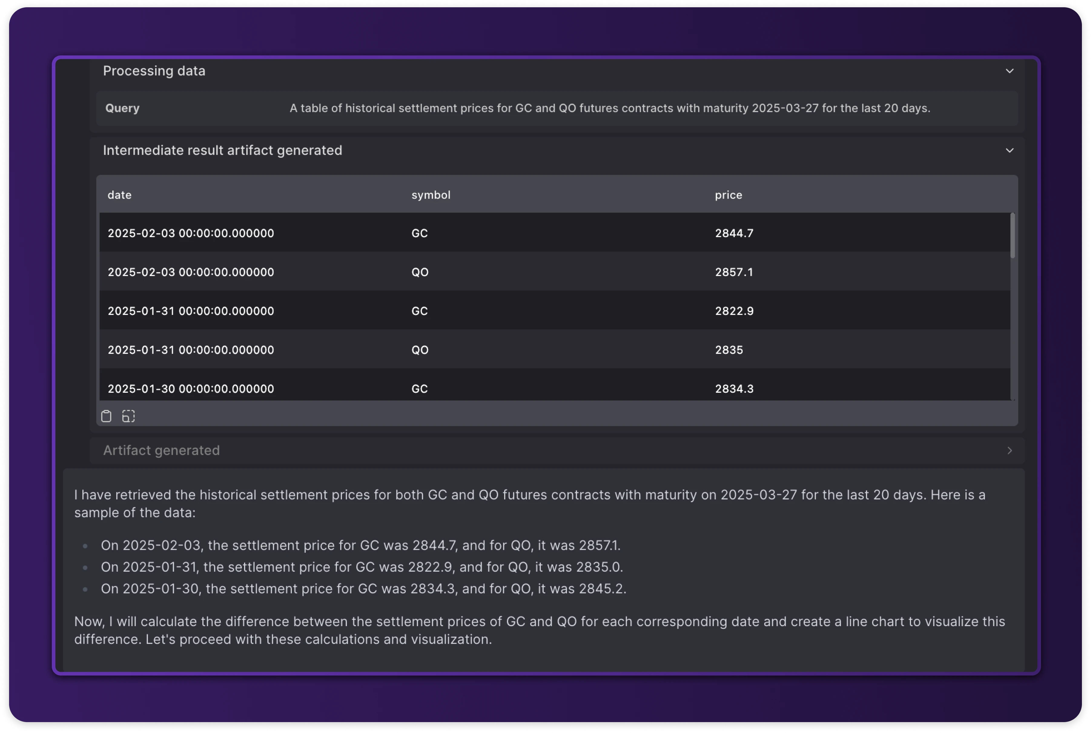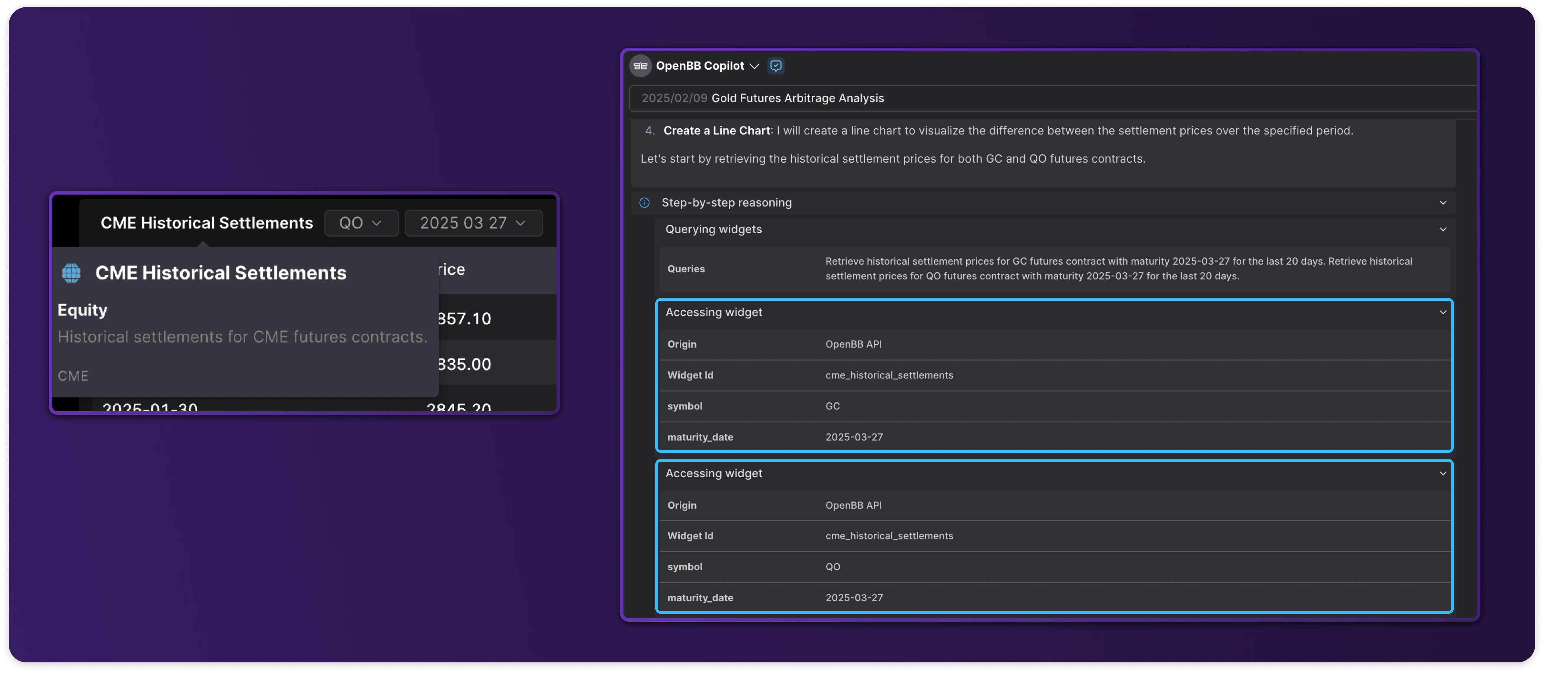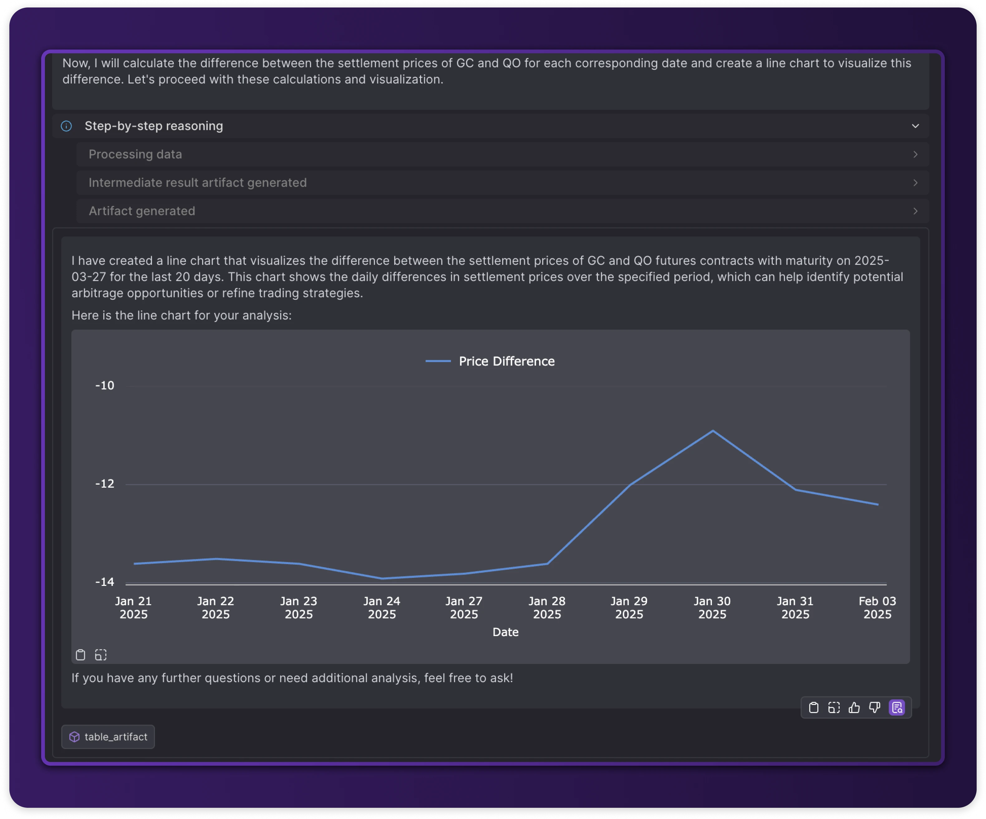 For more sophisticated tasks like analyzing futures contracts for arbitrage opportunities, our Copilot can make multiple function calls, process the data, and create visualizations.