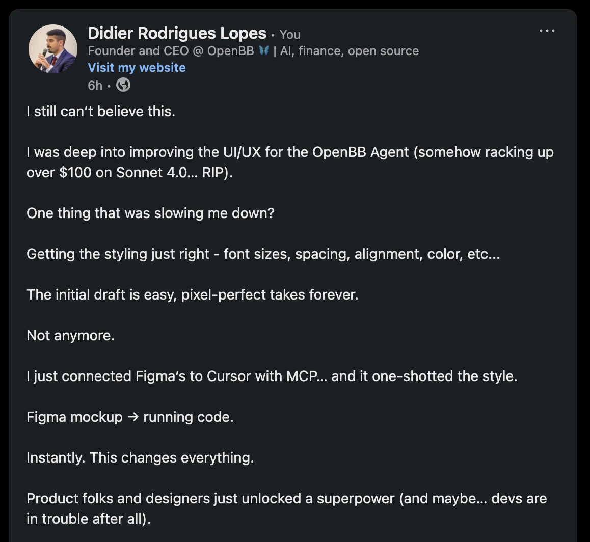 As I was working on OpenBB, and needed to copy the style from the Figma mockups - I stumbled upon Figma MCP.