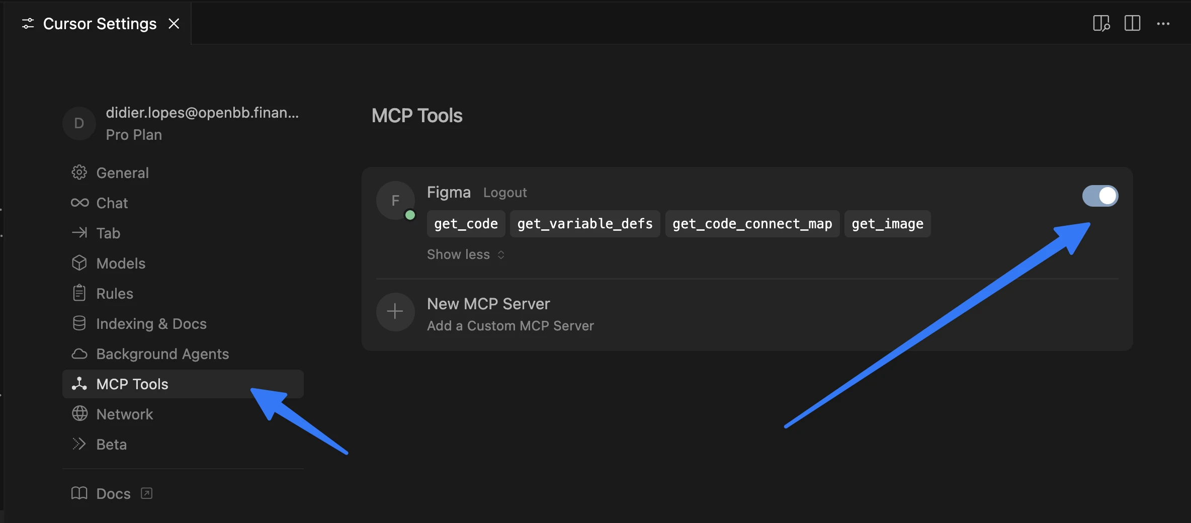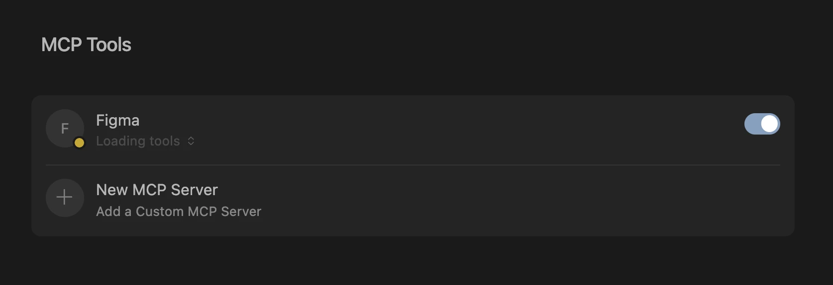 After a few seconds you can toggle the Figma MCP and you should be able to see a few tools.