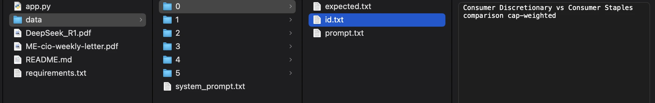 | 1 | Consumer Discretionary vs Consumer Staples comparison equal-weighted | By how much did Consumer Discretionary outperform Consumer Staples over the last three months on equal-weighted? | +13% |