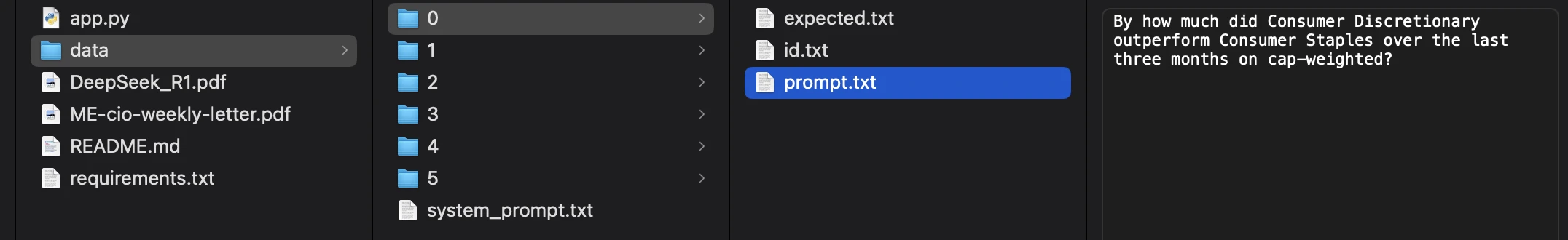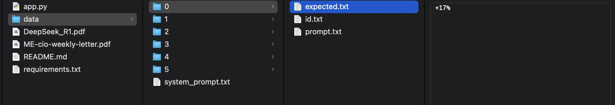 expected.txtdirectly from the interface. This was particularly relevant when I saw that the LLM as a judge failed when the model retrieved 68.0% for a particular prompt and the expected string I had was 68.0. In this case, the model was actually accurate and my expected value should have been either 68.0% or 0.68.