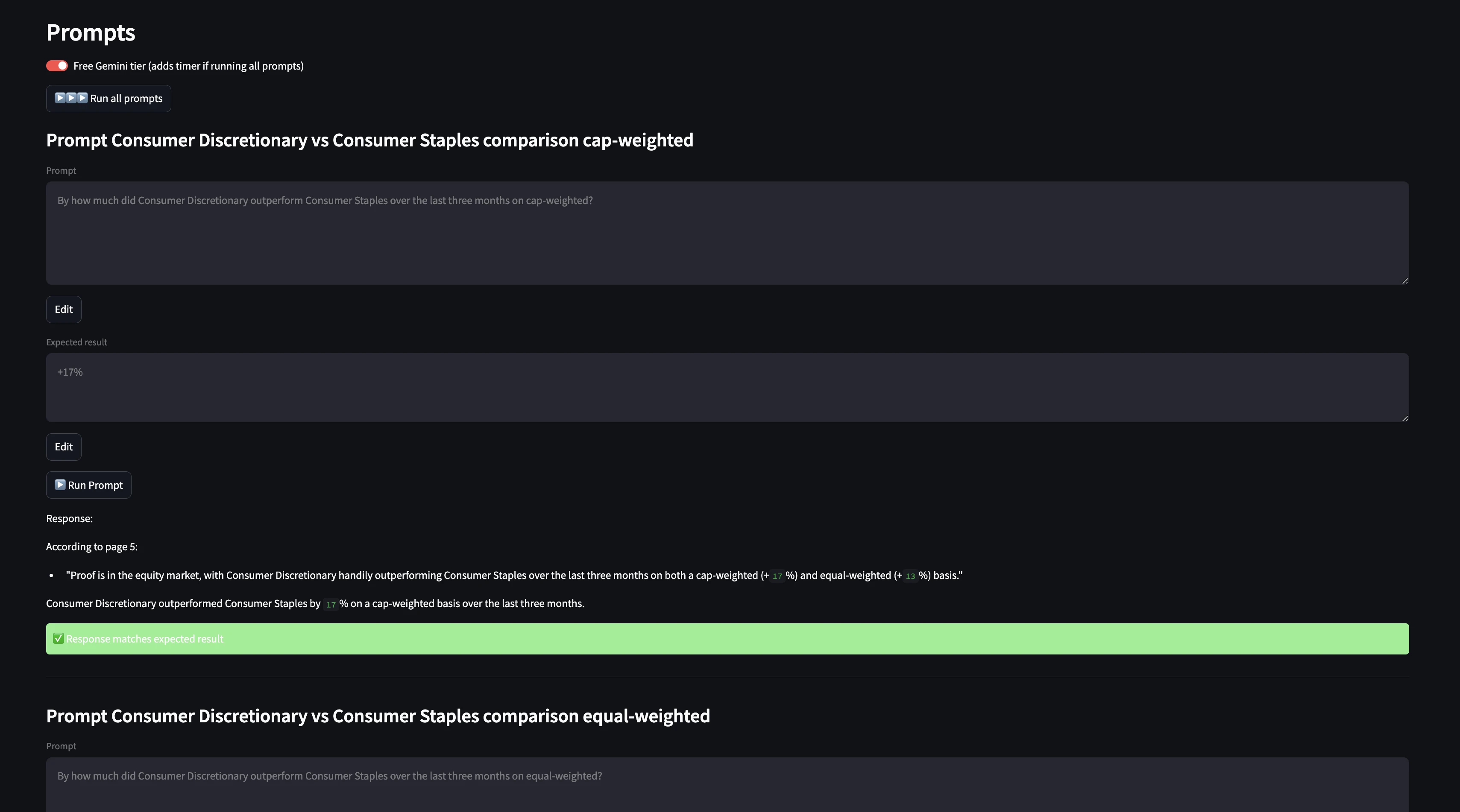By clicking on "▶️▶️▶️ Run all prompts", all prompts get run utilizing Gemini 2.0 Flash with the context provided, in the following format: