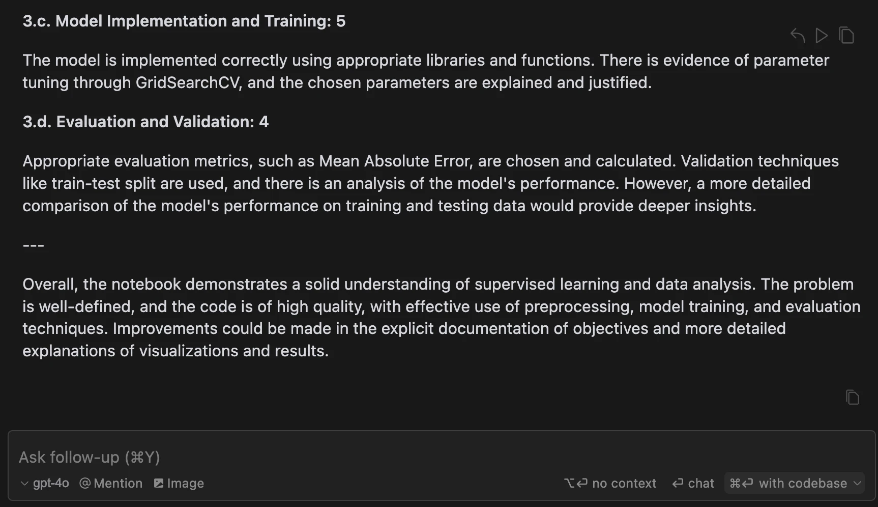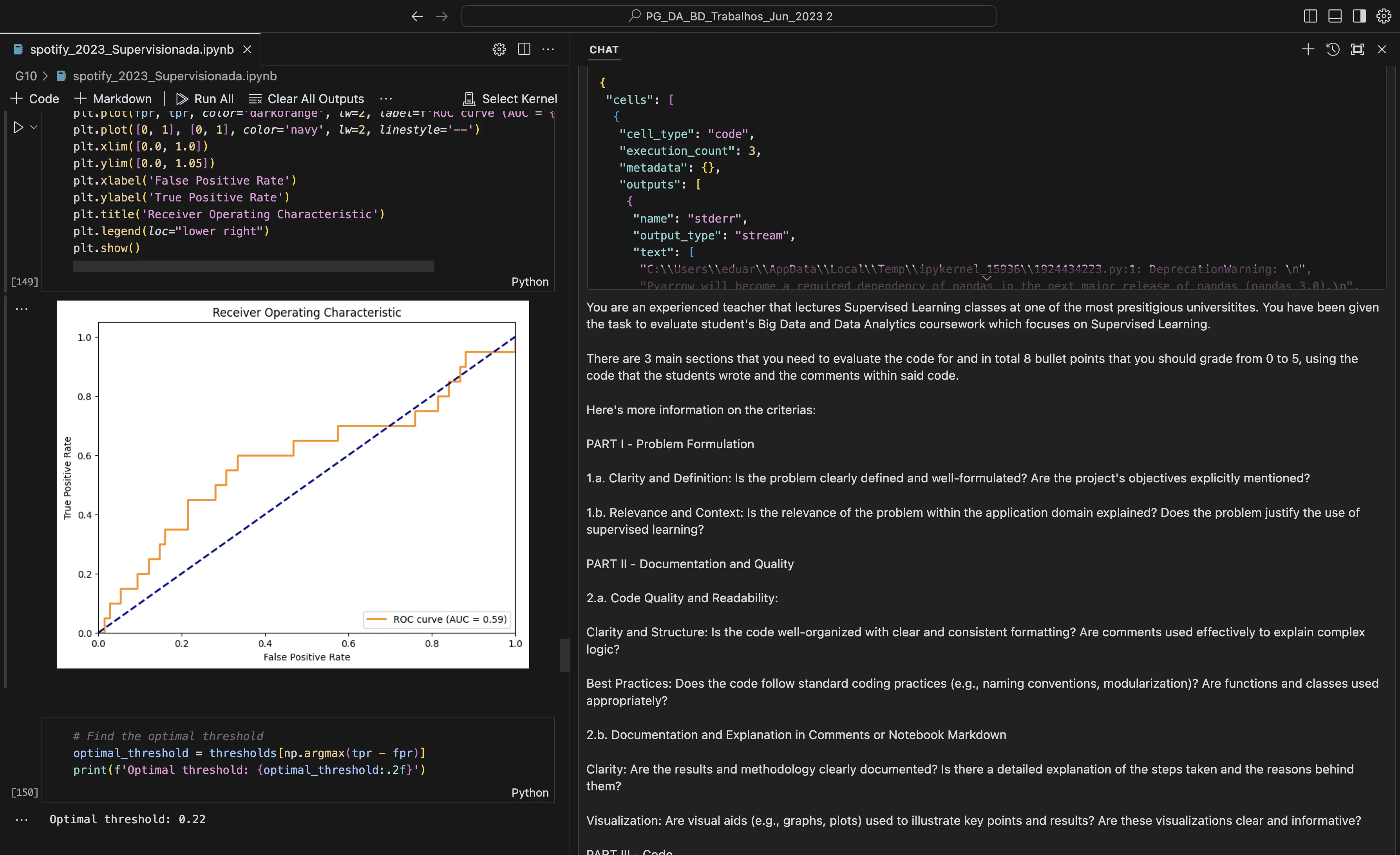 Given that I just wanted GPT-4o to quickly review each of the criterias based on the code, I created a prompt that I could use for all of notebooks that the students sent.