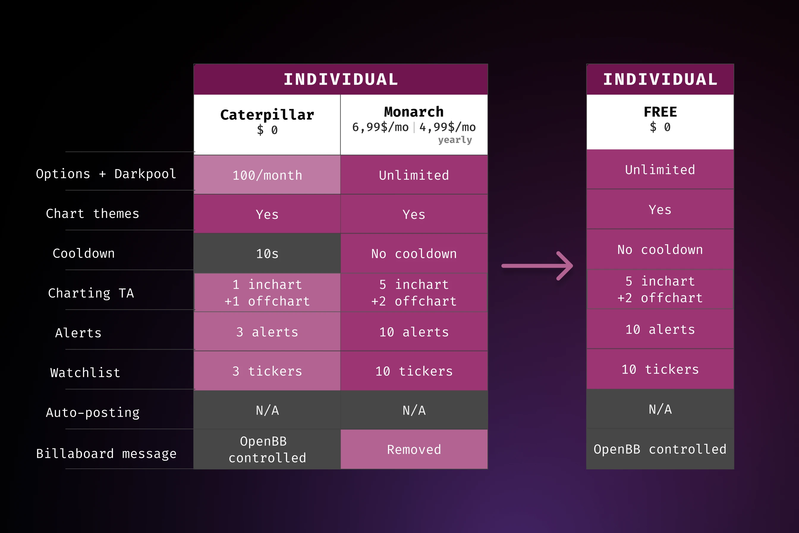 So in May 2023 we went pretty much all-in on considering the OpenBB Bot as a marketing expense, and removed the individual paid tier. You can see that announcement here.