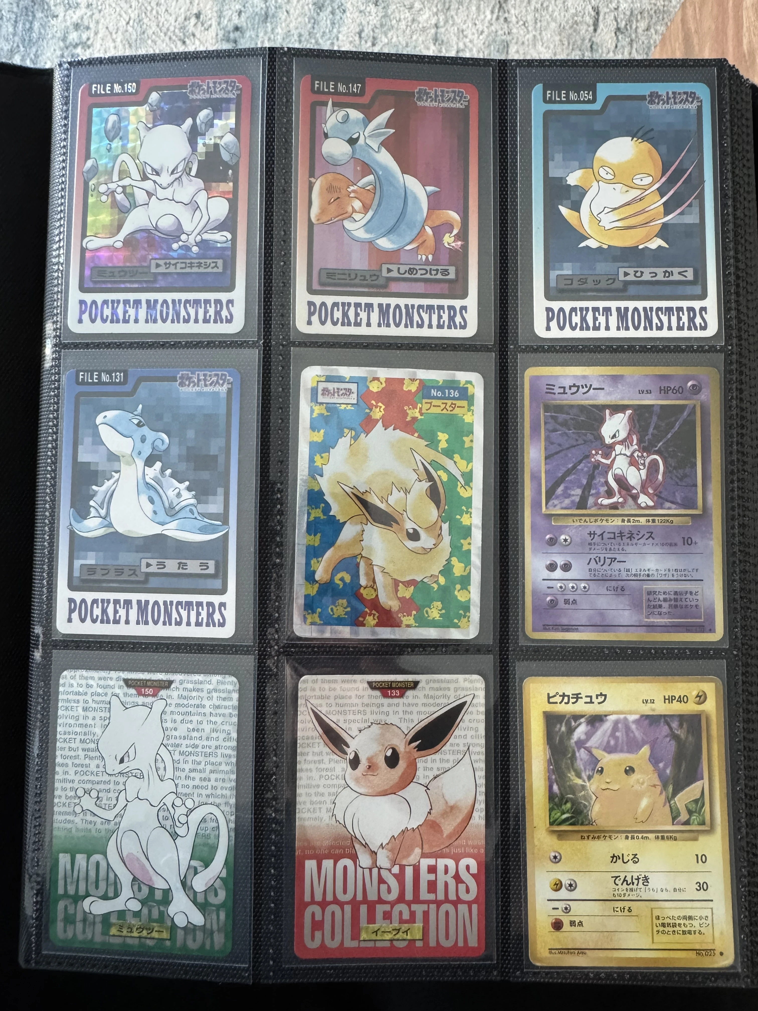 A binder page of early Carddass cards, including standard Monsters Collection cards and prism holos.