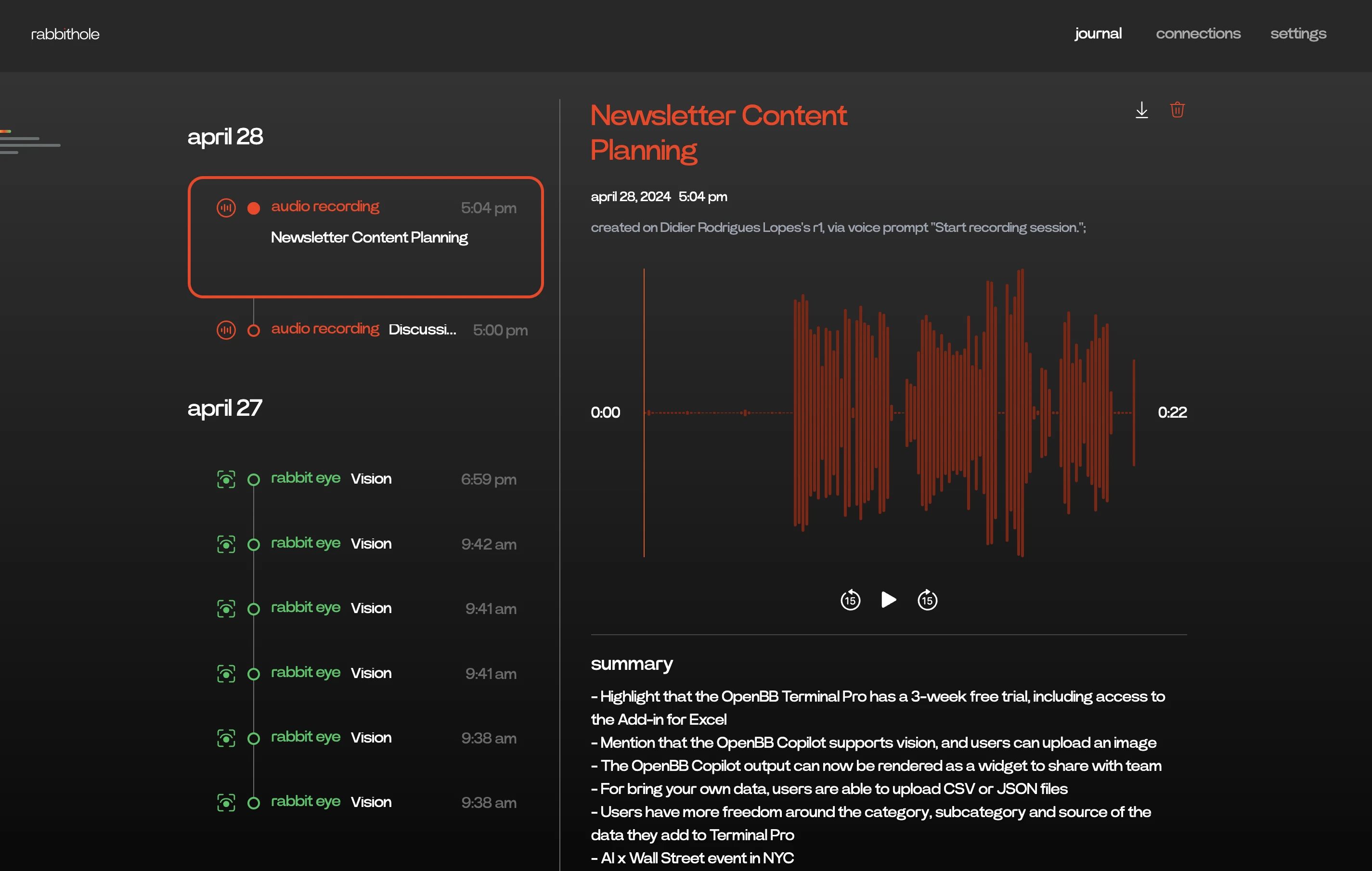 The voice recording feature is pretty good. If you are a content creator (e.g., writer, youtuber), I think this is very powerful. The way I see it is that rabbit offers way less distractions than your phone, so you could go on a walk and take r1 and just speak with it to brainstorm ideas. Then go to the website and analyze your ideas to transform it into content.