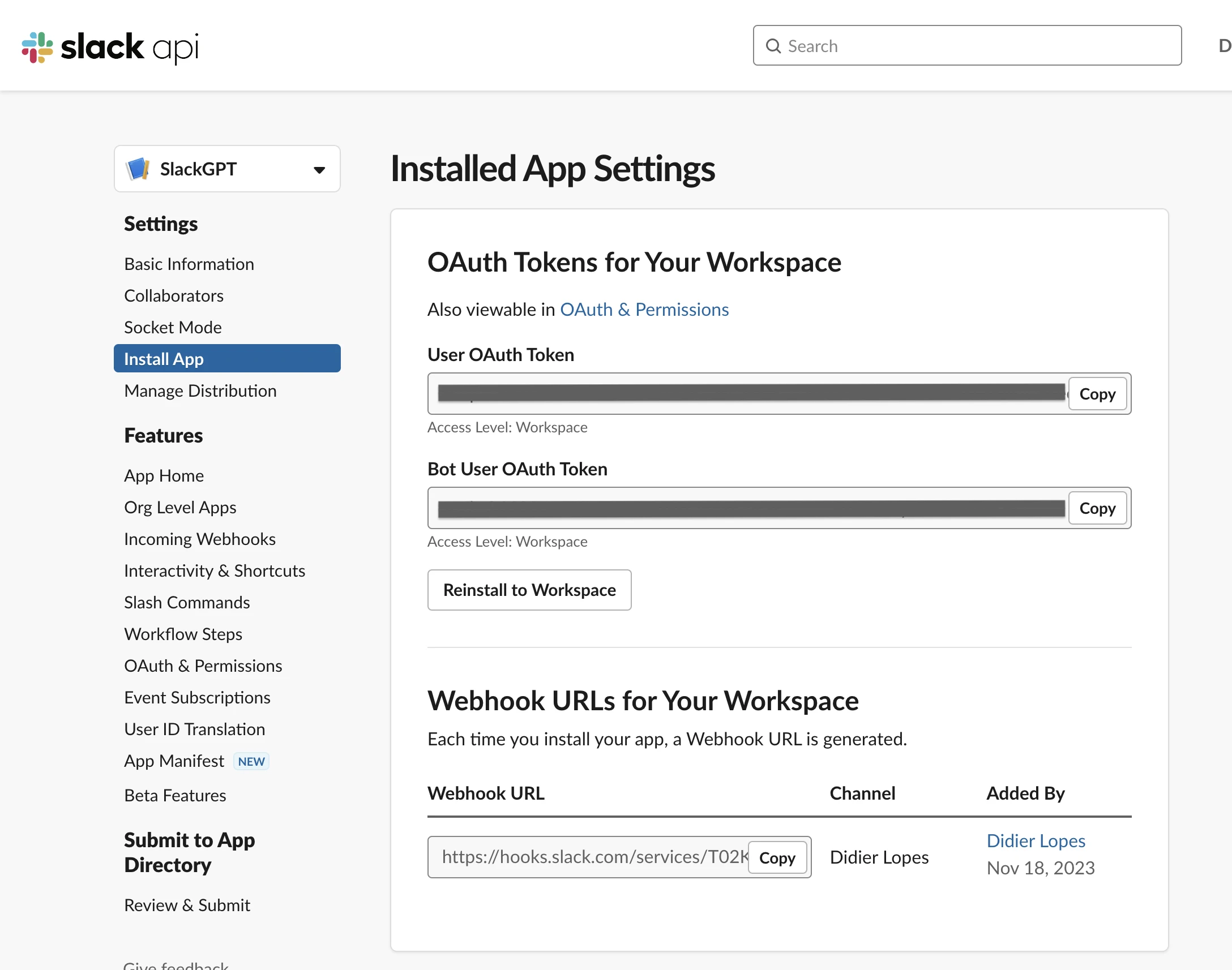Get the User OAuth Token which exists in the Install App settings. This will be needed to use Slack's SDK. Set this value as the