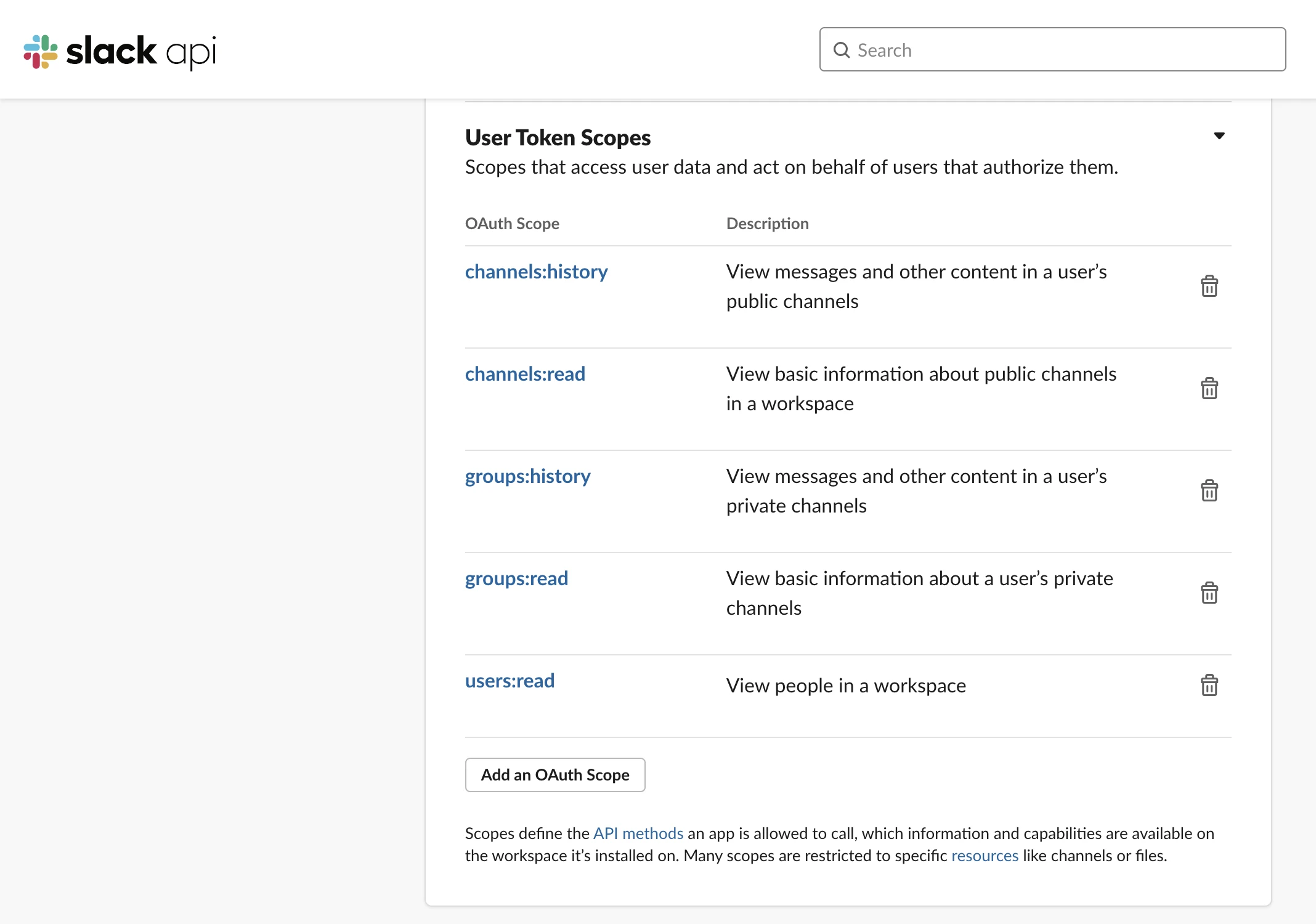 conversations_history: This method retrieves a conversation's history of messages and events. It requires the channels:history scope for public channels, or groups:history for private channels and im:history for direct messages.