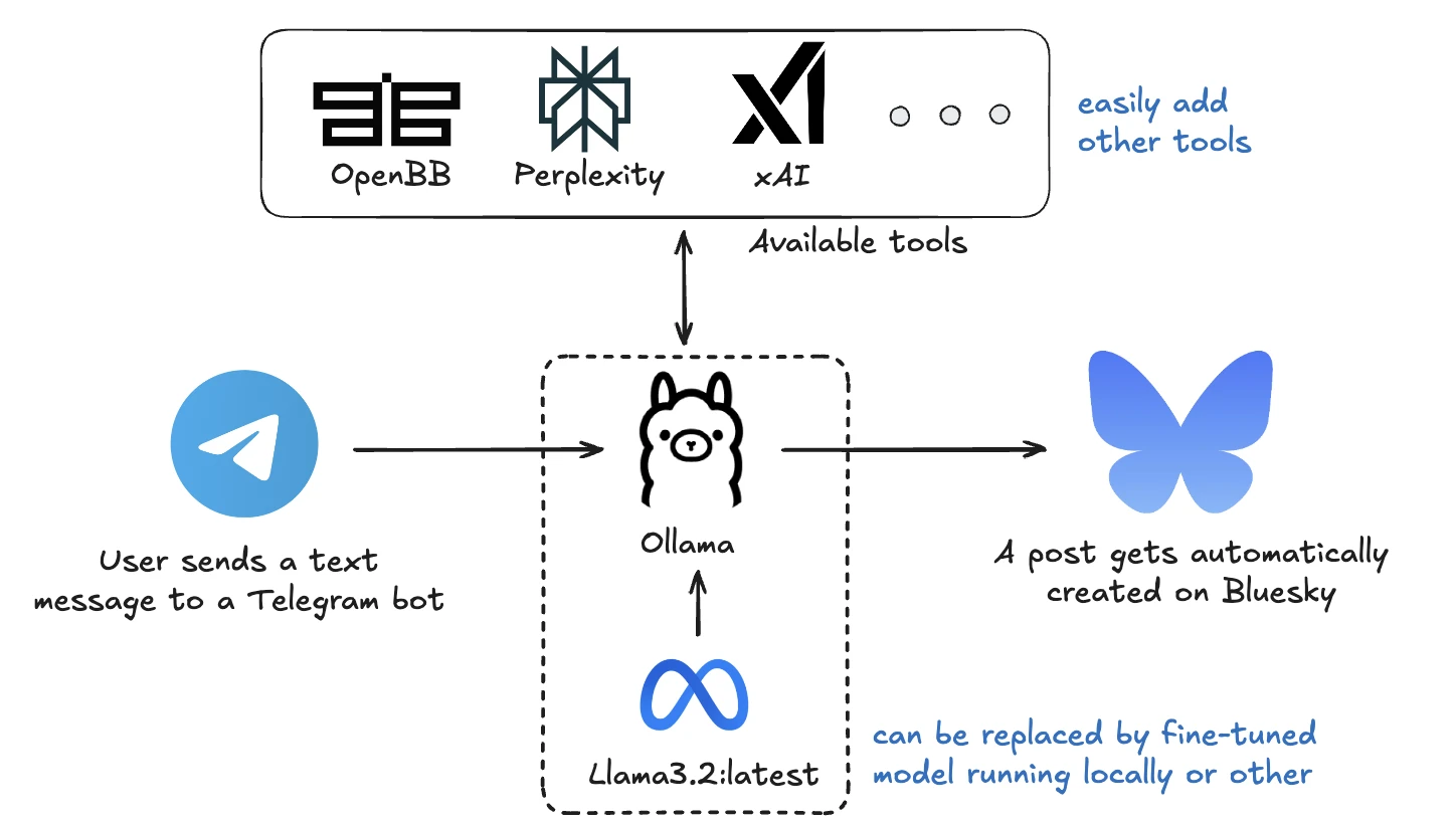 A practical guide to building an AI agent that processes Telegram messages through a local LLM, gathers context from various sources (OpenBB, Perplexity, Grok), and automatically posts content to Bluesky.
