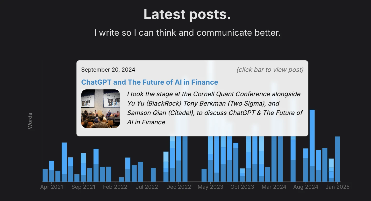 Learn how I built an open-source tool that generates beautiful SVG visualizations of your blog post history, supporting both JSON and ATOM XML feeds. Perfect for keeping yourself accountable and monitoring your writing progress over time.