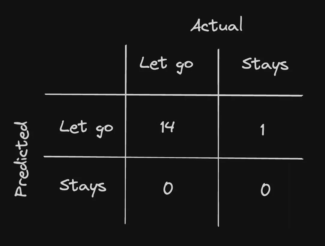 If we go into the machine learning domain and have a model that predicts that a team member who gets into a PIP is let go every time - this is the classification matrix that we would have.